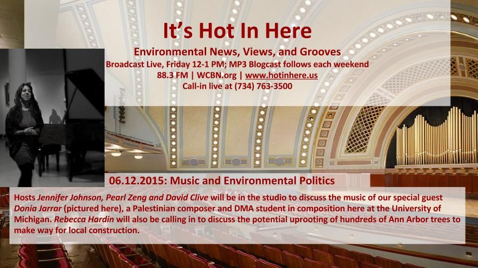 Rebecca Hardin, Jennifer Johnson, David Clive and Bailey Schneider were joined in the studio by the lovely Donia Jarrar, a Palestinian composer and DMA student here at the University of Michigan. On this week's segment of It's Hot In Here, we discussed the pros and cons of the proposed reconstruction of Geddes Avenue and its social, economic and psychological effects on the Ann Arbor community, transporting trees on the University of Michigan campus, Donia's recent trips to Palestine and her work here at U of M and over in the Middle East.